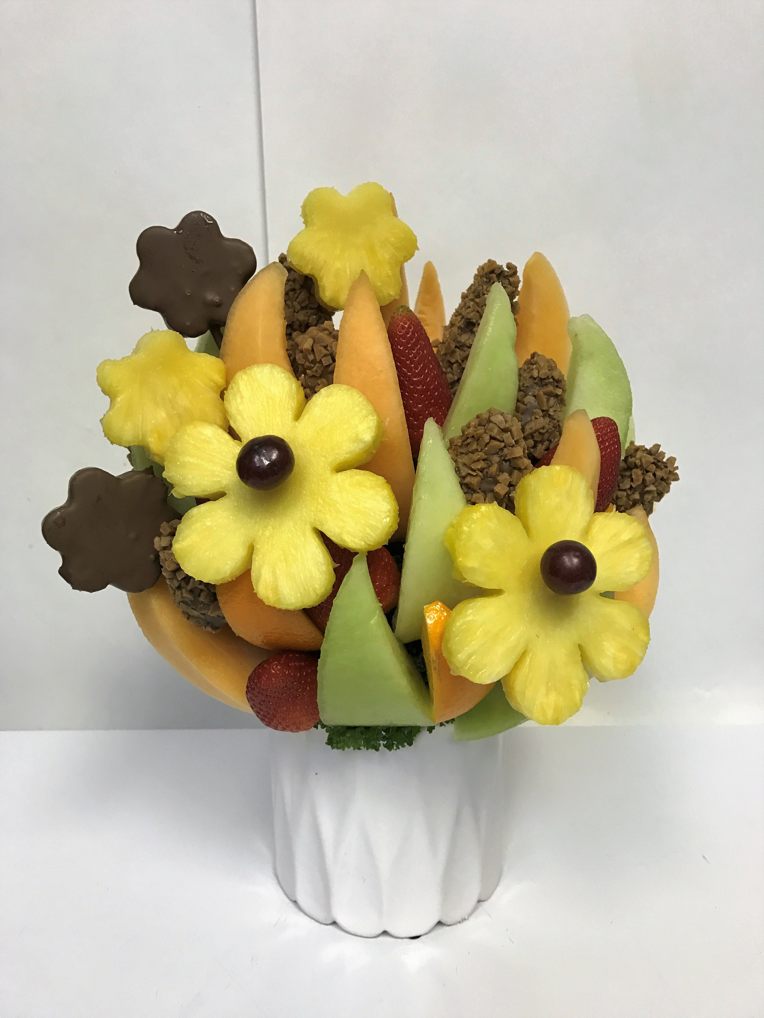 Enjoy apples dipped in toffee bits, chocolate covered strawberries and pineapple and lots of cantaloupe, honeydew, oranges and plain strawberries.
