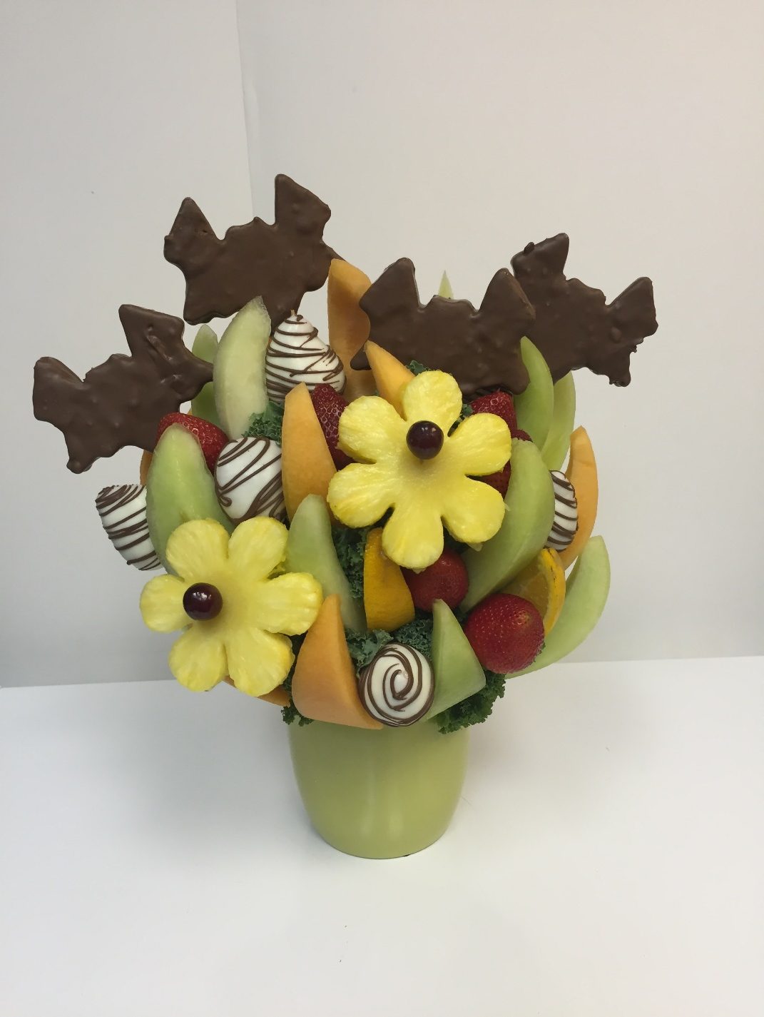 Halloween Bat Bouquet Melon, oranges and pineapple go along with these chocolate covered pineapple bats and dipped strawberries. $75.00 Melon, oranges and pineapple go along with these chocolate covered pineapple bats and dipped strawberries. Quantity Add to cart Category: Halloween Related products Candy Corn and Mummies Bouquet $ 75.00 Add to cart Halloween Eyeball Bouquet $ 100.00 Add to cart