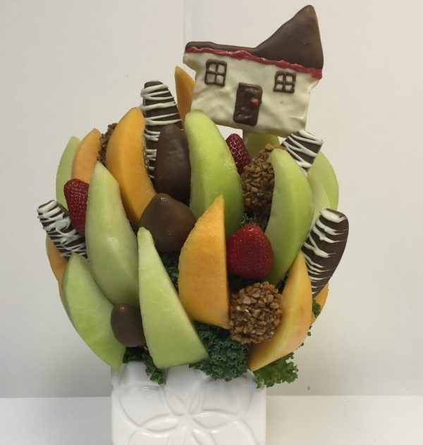 Perfect for the new home owner! Dipped apples and strawberries as well as strawberries dipped with toffee bits; melon tops off this sweet and simple bouquet!