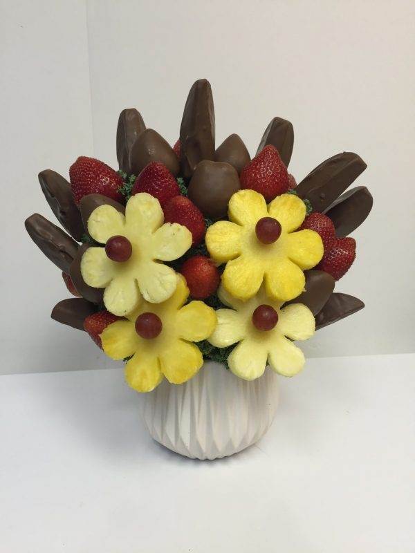 We create our bouquets every day and we can never repeat an identical bouquet, it’s always unique and amazing. Some ingredient may very in size and we put more or less into bouquets, while maintaining the same size, value and design. Fresh fruit arrangement includes; Apples and strawberries dipped in Dark chocolate. Plain strawberries and pineapples as well to enjoy.
